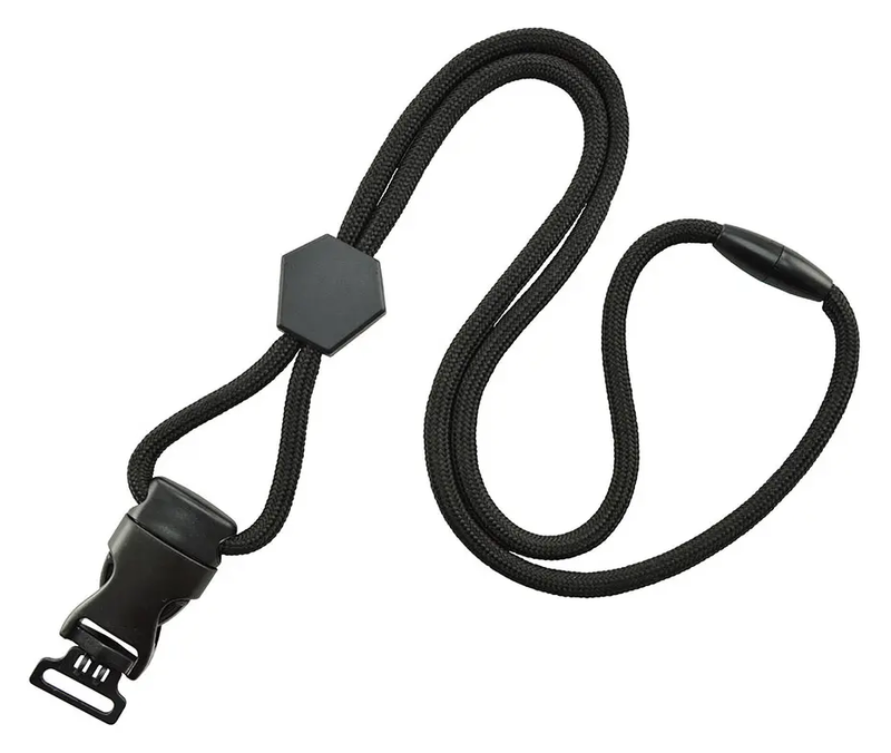 1/4" round polypropylene lanyard with detachable combo loop. End fitting can be removed and re-secured to the lanyard. Loop end fitting is perfect for attaching a strap clip. Includes a breakaway and customizable diamond-shaped slider (3/4" imprint).