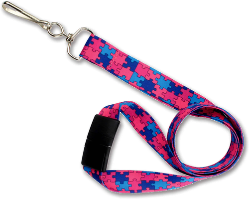 3/4" polyester lanyard with autism awareness puzzle piece design. Measures 36" in length. Swivel hook end fitting for easy card attachment. Breakaway included.