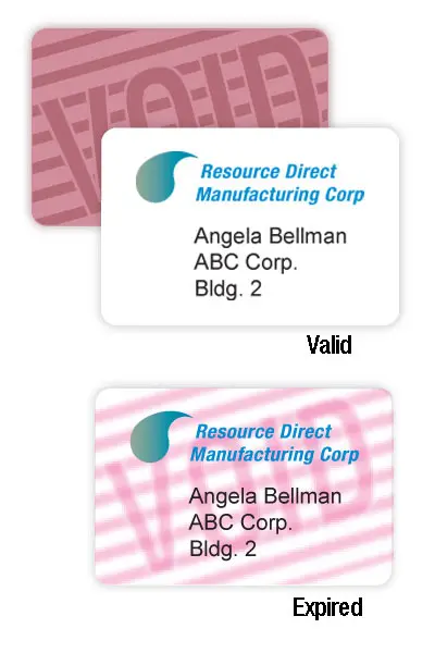 Expiring visitor badges change colour or develop slanted red lines. The change means the badges are 'VOID.' To activate expiring badges a specially treated layer of material is pressed to the back of the badges.