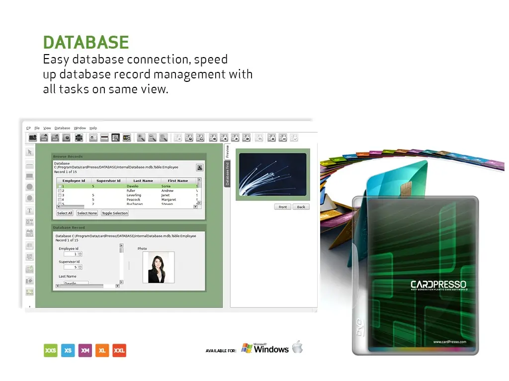 Perfect for getting started with card design and printing. Includes predefined templates, CR80 format, barcode (1D) support, internal database (up to 50 records), image and text objects, double-sided printing, and Ethernet printer connectivity.