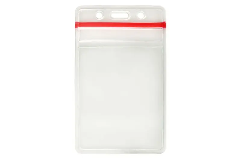 Protect and display credentials with this heavy-duty clear vinyl badge holder, designed for flexible use in both horizontal and vertical orientations. Featuring a red, zipper-like resealable top, it provides extra protection against dirt, moisture, and weather, keeping IDs safe and secure. With slot and chain holes for easy attachment to lanyards or badge reels, this holder is ideal for professional, event, and security applications where reliability and durability matter.