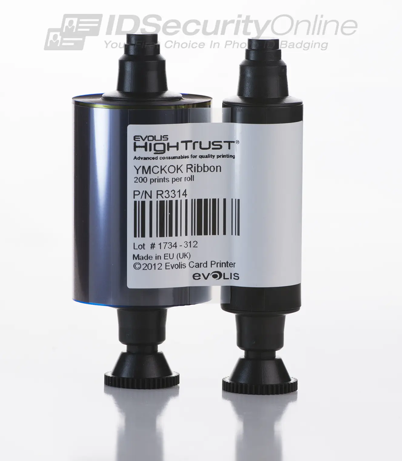 The Evolis R3314 YMCKOK full color ribbon yields 200 full color prints.