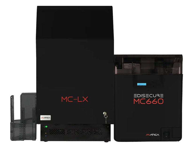 The MC660 offers modular upgrades, including inline lamination for enhanced card durability and an optional laser marker for Matica Secure Protected Image (MSPI™) technology. Its encoding options support magnetic stripe, contact, and contactless smart cards.