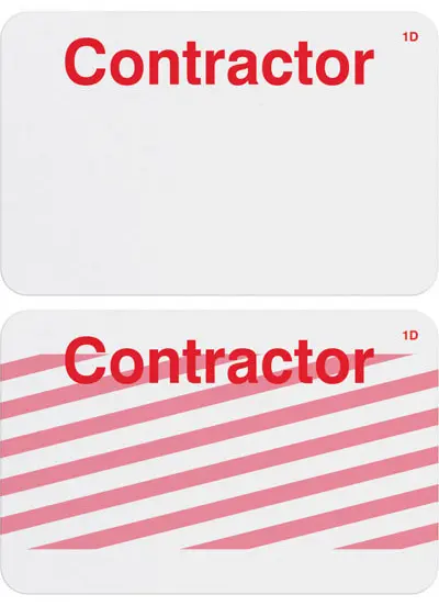 Quickly identify your guests with this adhesive-backed expiring badge. Each badge can be personalized by hand with a pen, pencil or marker. Once it's issued, the badge will show a series of red bars after a period of 12-14 hours, making it easy to tell when a guest's time is up. This badge features a printed "CONTRACTOR" title, allowing it to be used for role recognition. Additional printed titles are available. Badge measures 1 7/8" x 2 7/8".