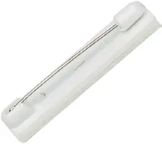 White, all-plastic safety pins with rectangular, pressure-sensitive, polystyrene base, tabbed release paper and high-bond adhesive pads.